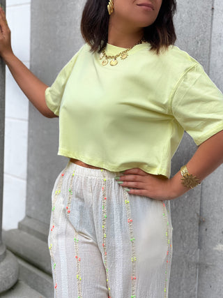 Caractéristiques : Coupe courte, modèle oversize, col rond