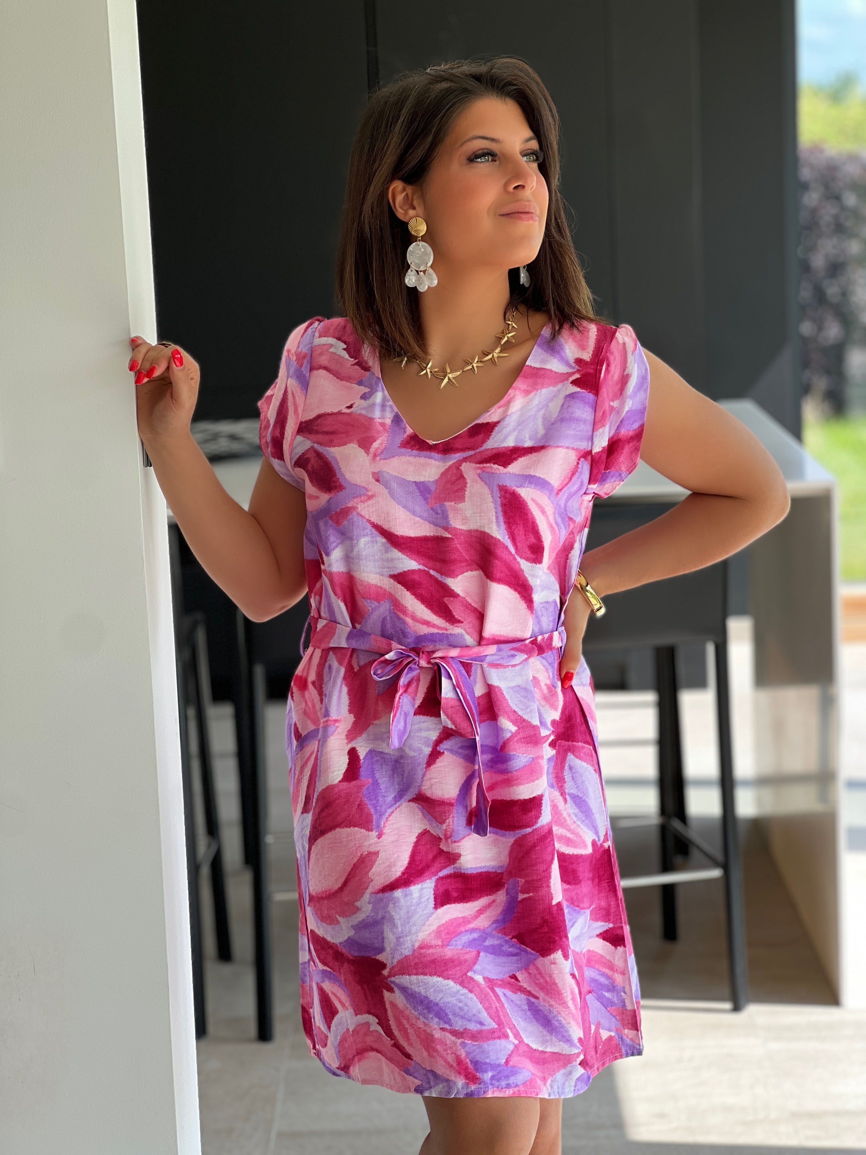 Caractéristiques : col rond, ceinture comprise, fermeture par bouton dans le cou